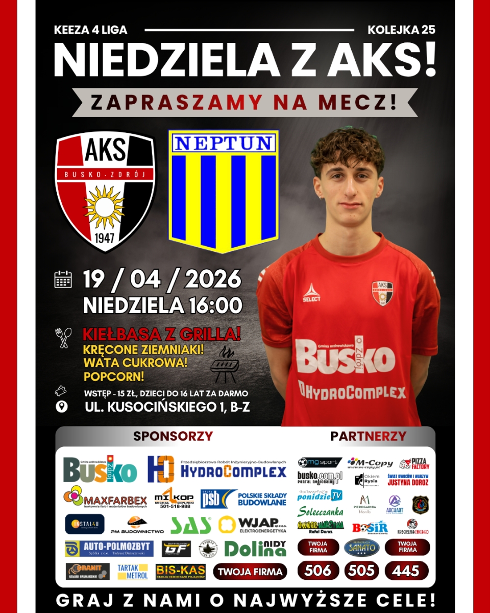 AKS 1947 Busko-Zdrój w niedzielę 19 kwietnia o godzinie 16:00 zmierzy się na własnym stadionie z MKS Neptun Końskie w ramach 25. kolejki Keeza 4 Ligi. Gospodarze przystępują do meczu jako zdecydowany lider rozgrywek i zespół, który w tym sezonie wyznacza tempo całej stawce.